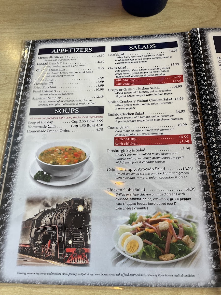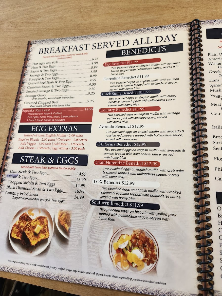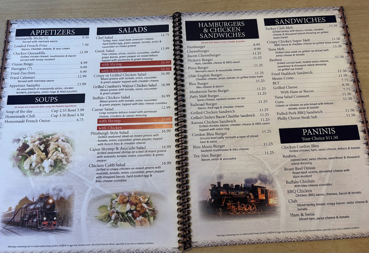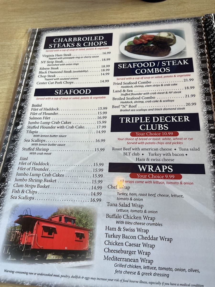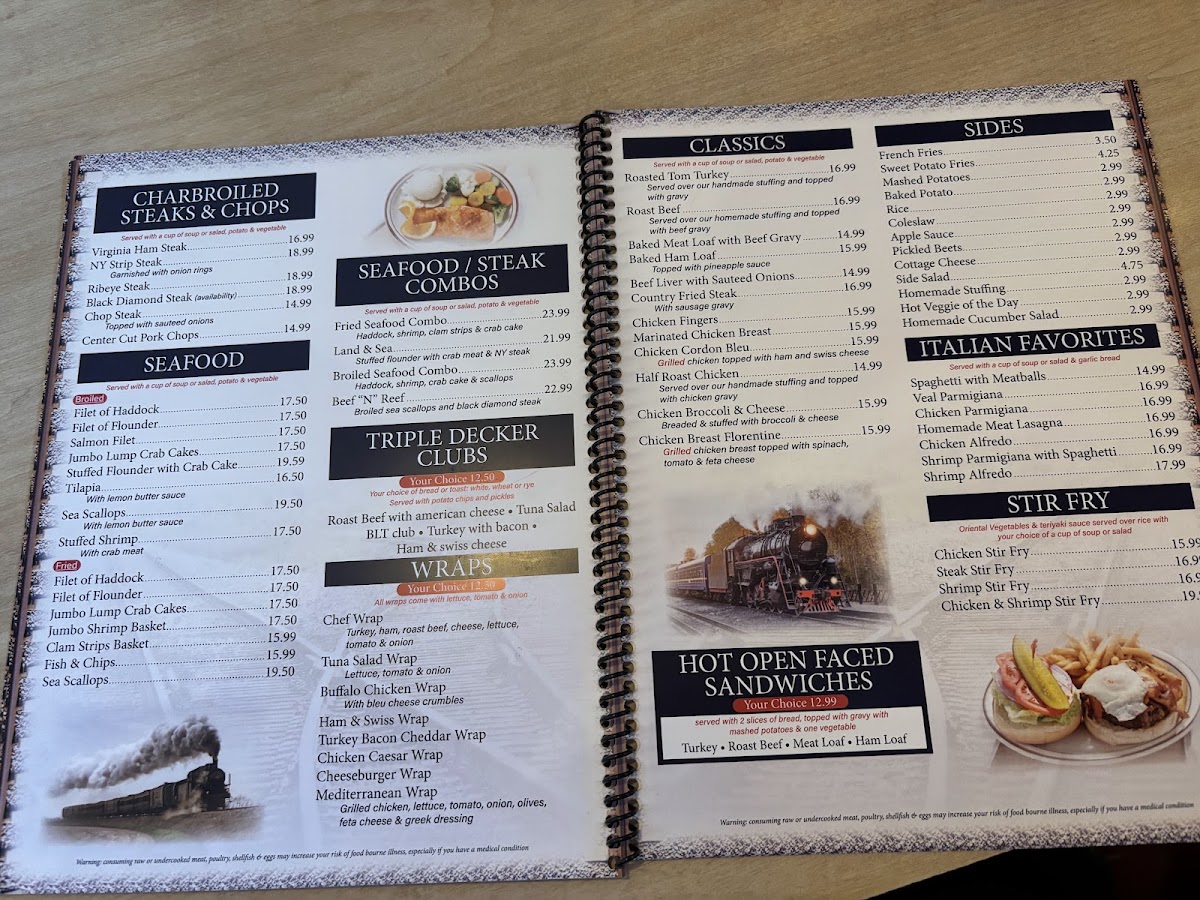 Start your morning with traditional breakfast staples like Egg Benedict, Scrapple & Eggs, or fluffy pancakes, perfectly suited to a laid-back breakfast or brunch setting. For midday or evening, the menu features comforting mains such as the Reuben sandwich, Chicken and Waffles, or the Country Fried Steak, delivering classic diner warmth that complements the relaxed and friendly atmosphere of this railroad-themed spot. Sides like Sweet Potato Fries and Peppers add a satisfying touch, while desserts including Coconut Cream Pie invite a leisurely finish to your meal.